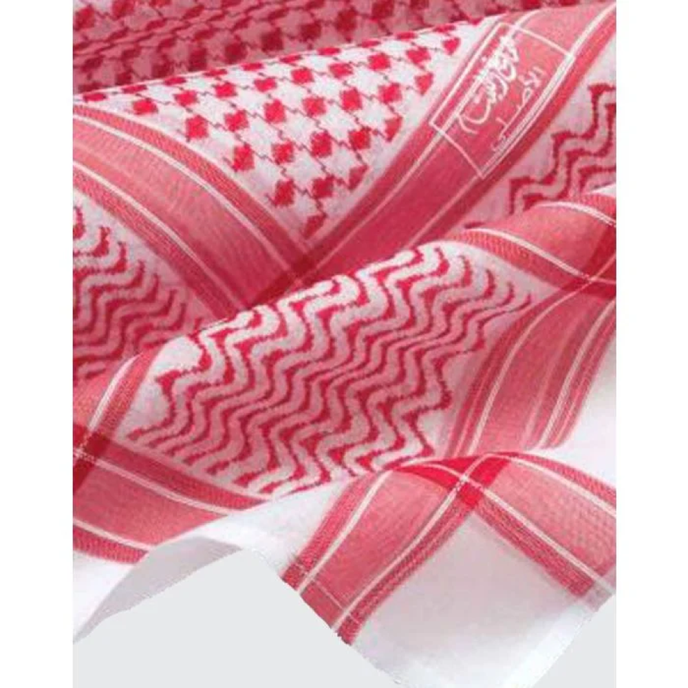 - اللون: درجات الأحمر الكلاسيكي تتناغم بدقة مع تفاصيل التصميم، تمنح الشماغ طابعاً عربياً أصيلاً.