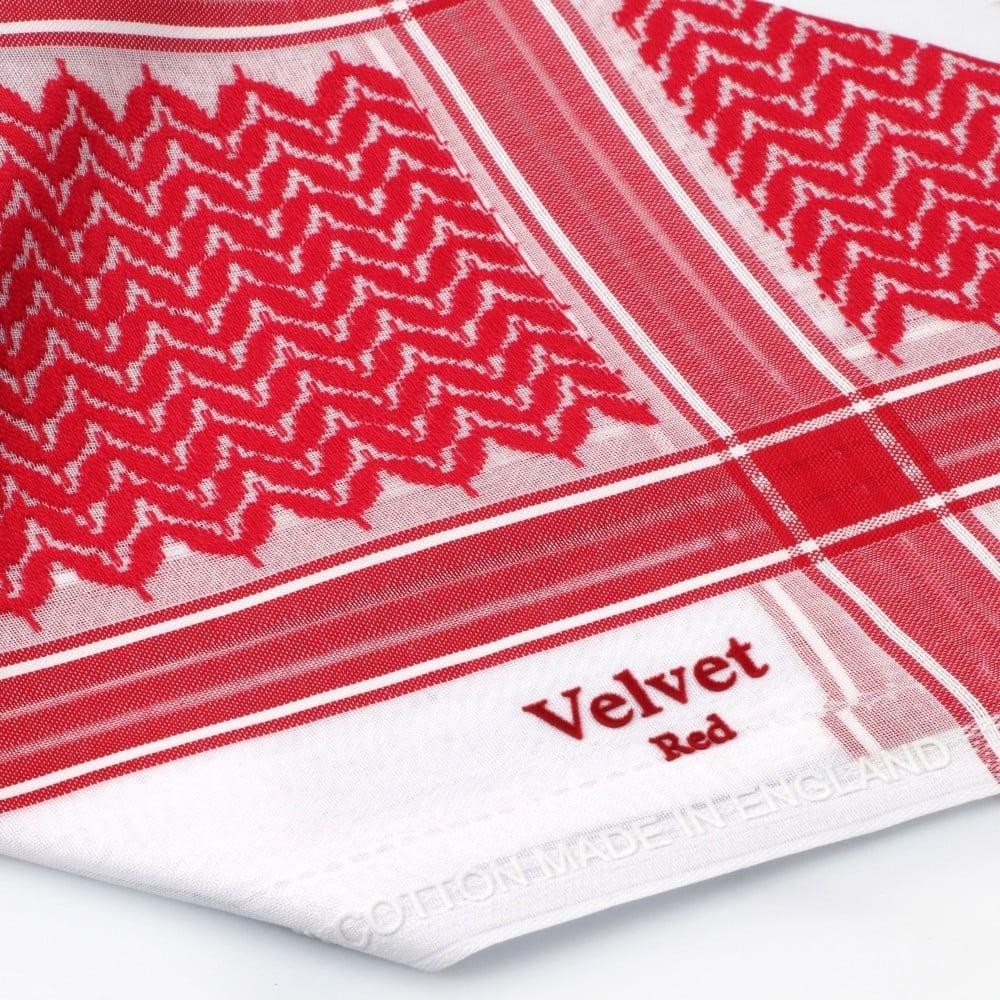 - شماغ فيلفيت يأتي باللون الاحمر دم الغزال وبختم اسود للماركة.
