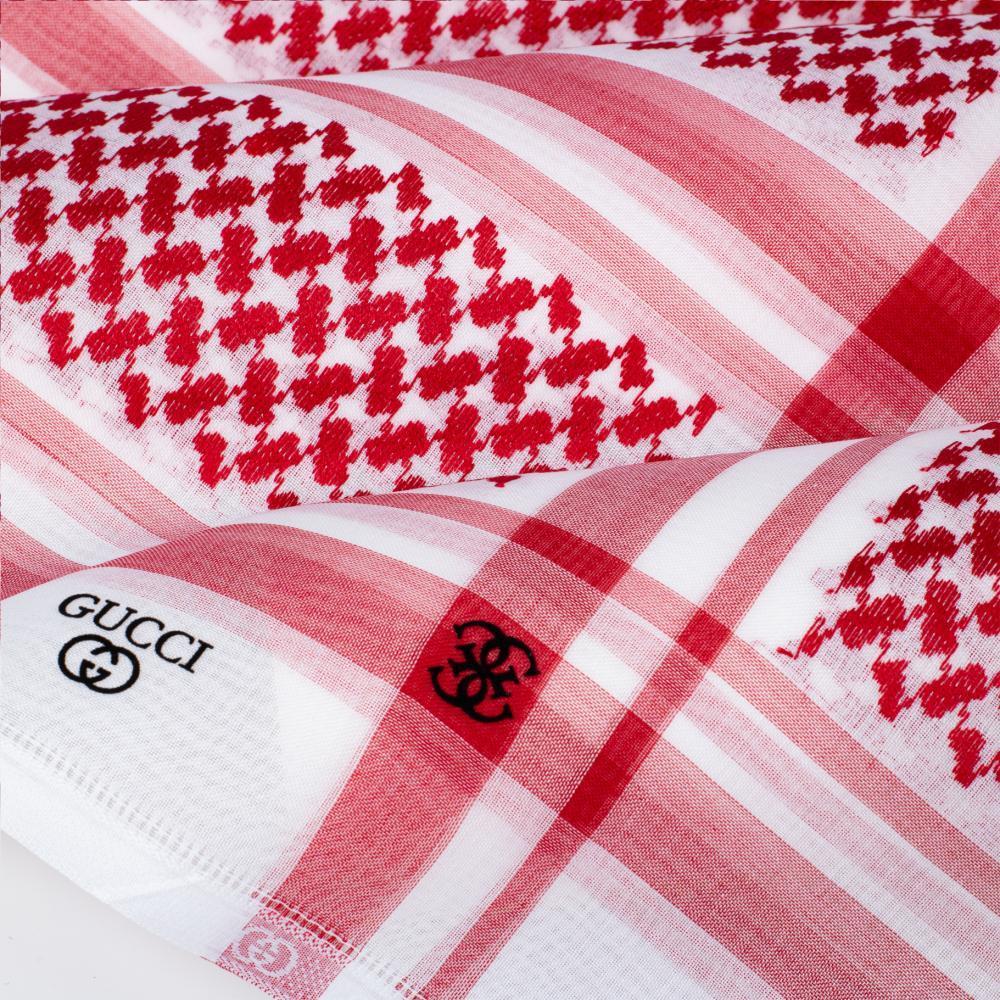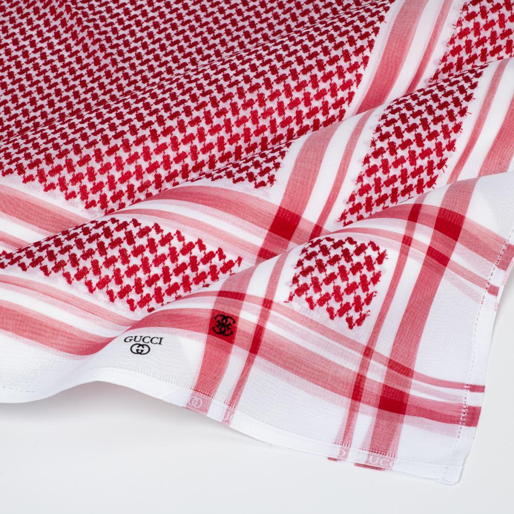- الشماغ يحمل ختم قوتشي باللون الأسود ليصبح قطعة فنية راقية ومميزة.